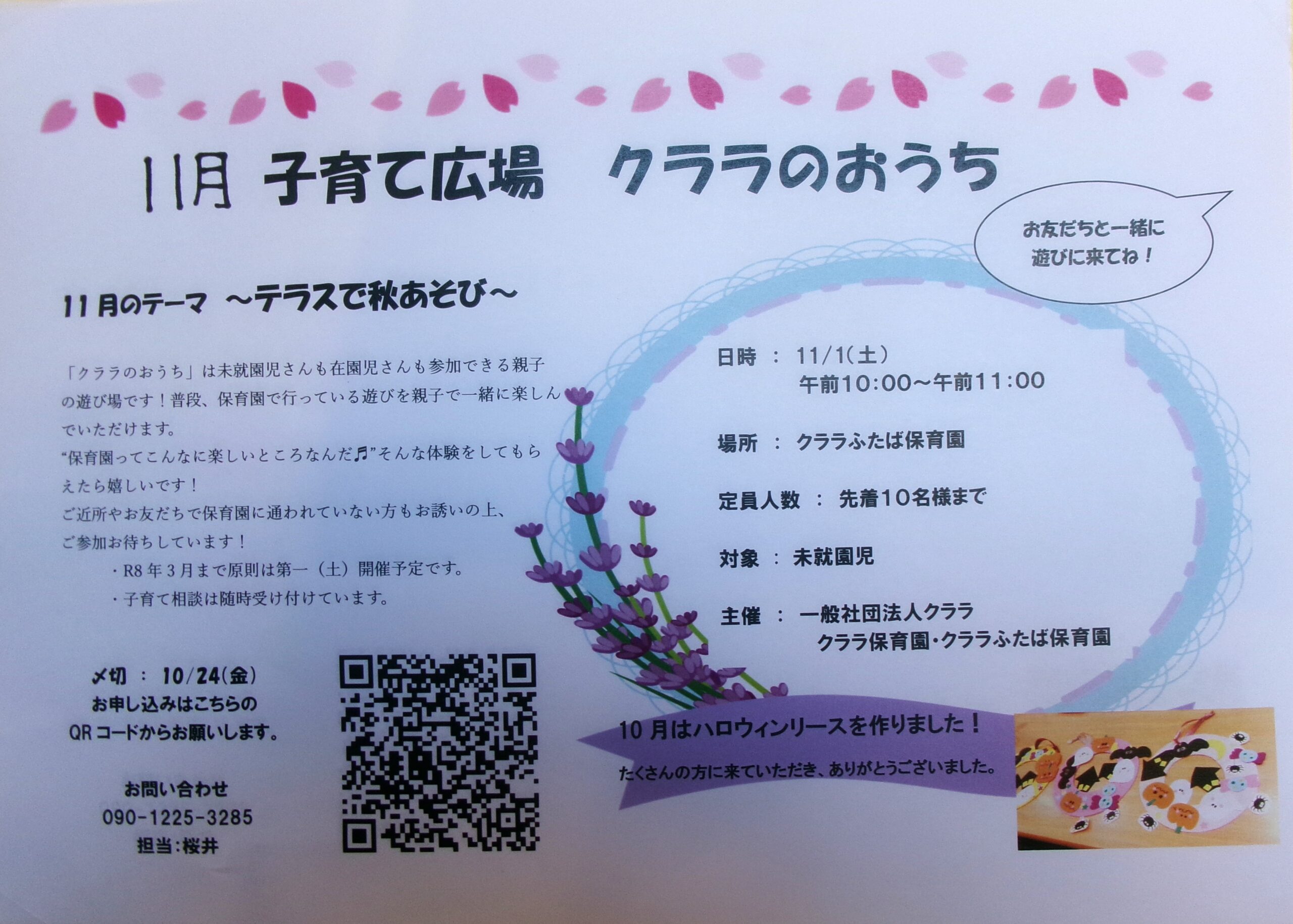 11月も子育て広場”クララのおうち”を開催いたします!未就園児の方ならどなたでも親子でご参加いただけます。お申し込みはQRコードより、よろしくお願い致します。