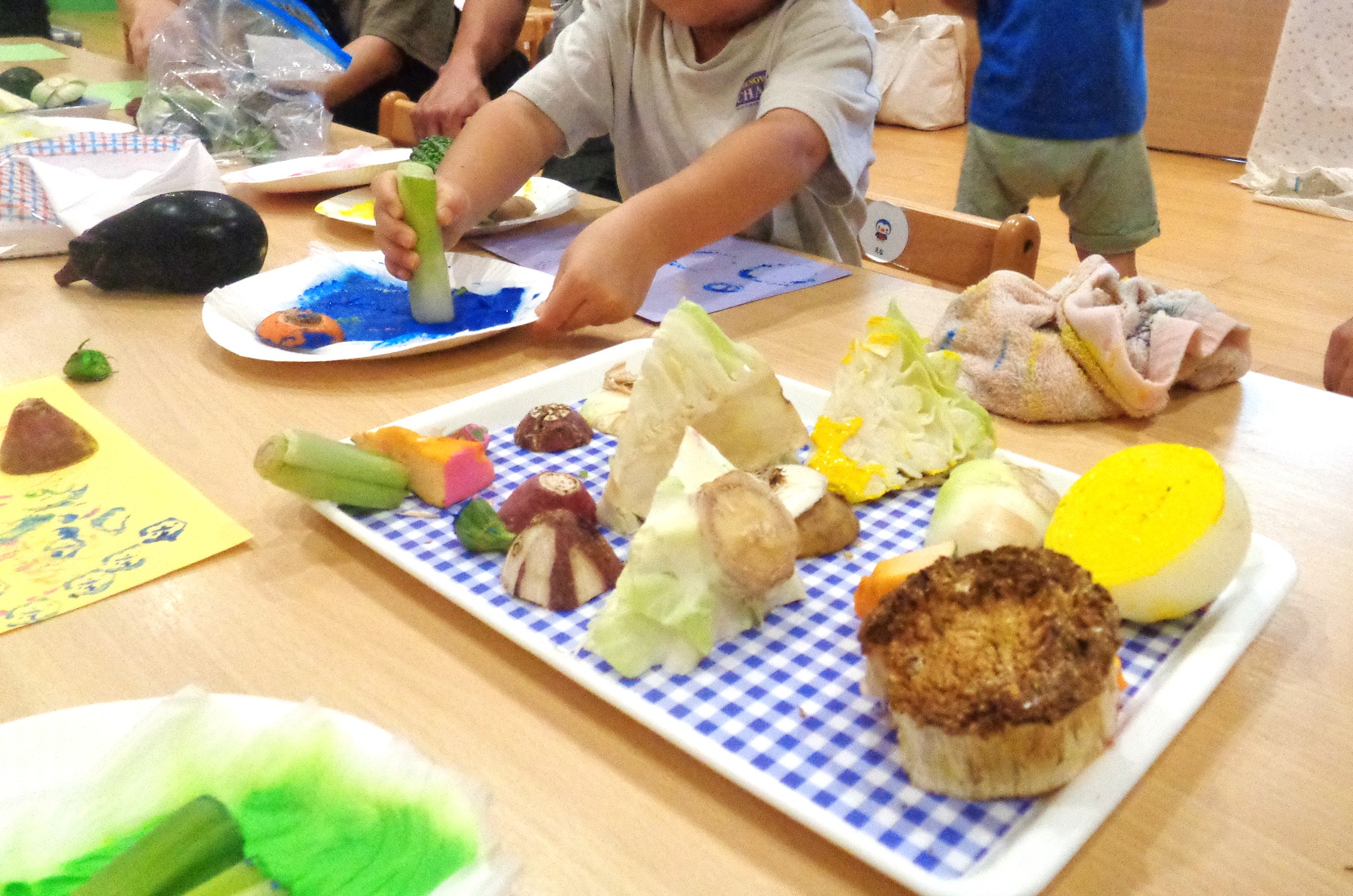 2025.09.10 9/5(土)子育て広場”クララのおうち”を開催しました!テーマは『野菜スタンプ!』野菜の切れ端に絵の具をつけてペタッ!ペタッ!こんなに可愛いアートができました。額縁に入れると宝物♡大事に抱えてバイバイする姿がとても可愛かったです。
