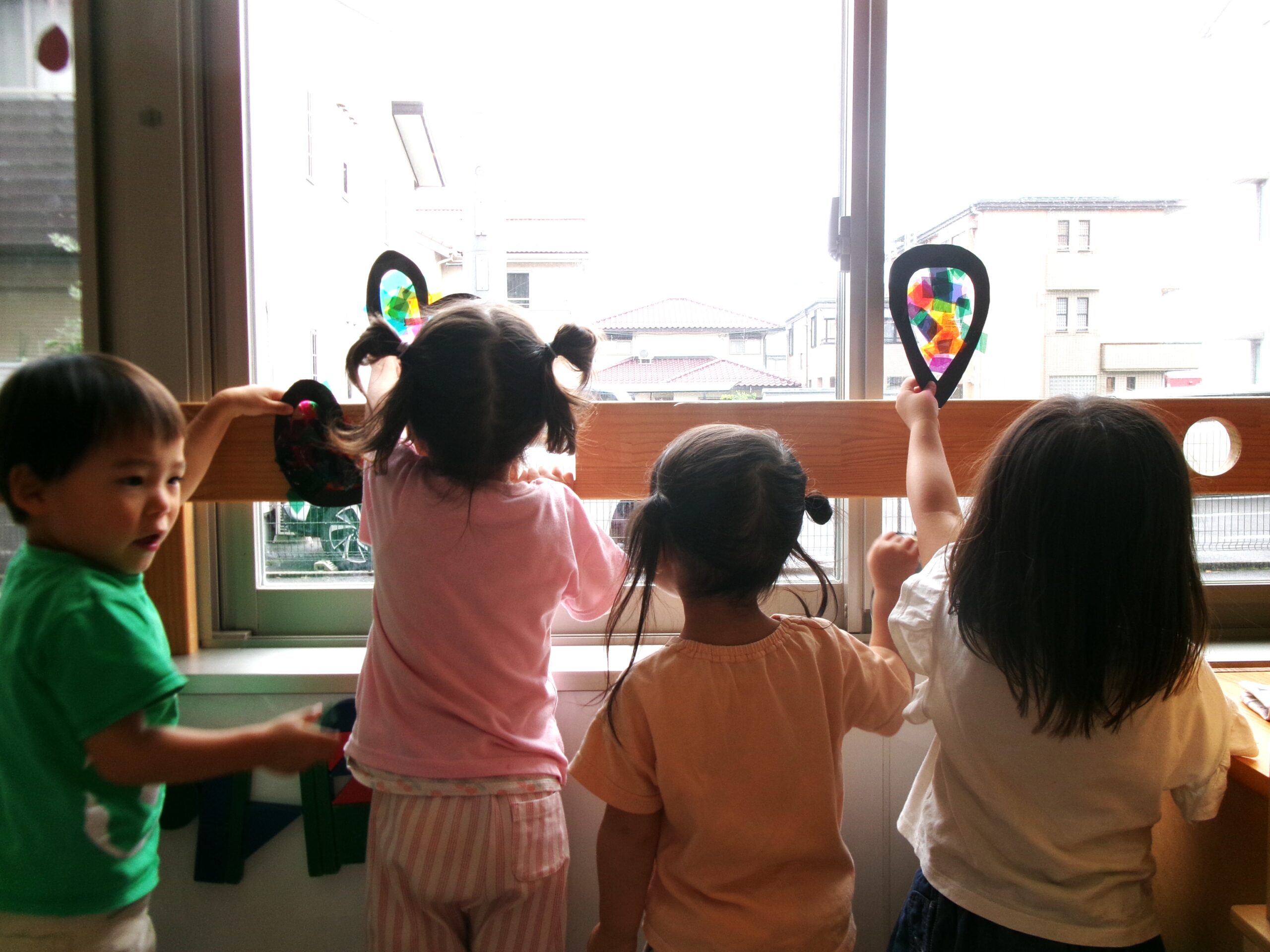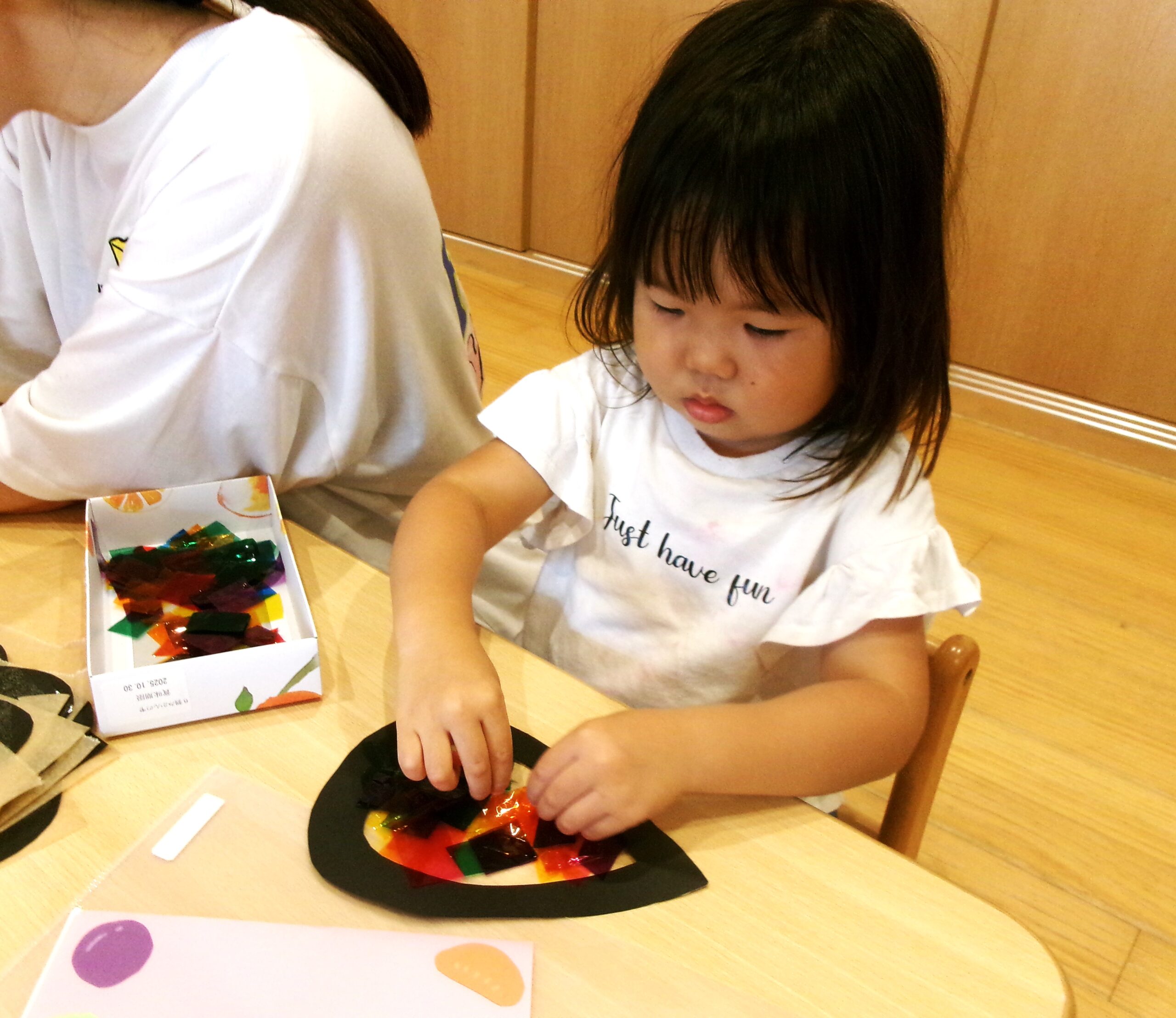セロファンを貼り付けて~、光にかざしてみよう!キラキラだよ~✨