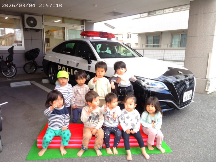 パトカーの運転席に乗せてもらったよ!片手運転!かっこいいでしょ~♬パトカーの前ではい!チーズ!