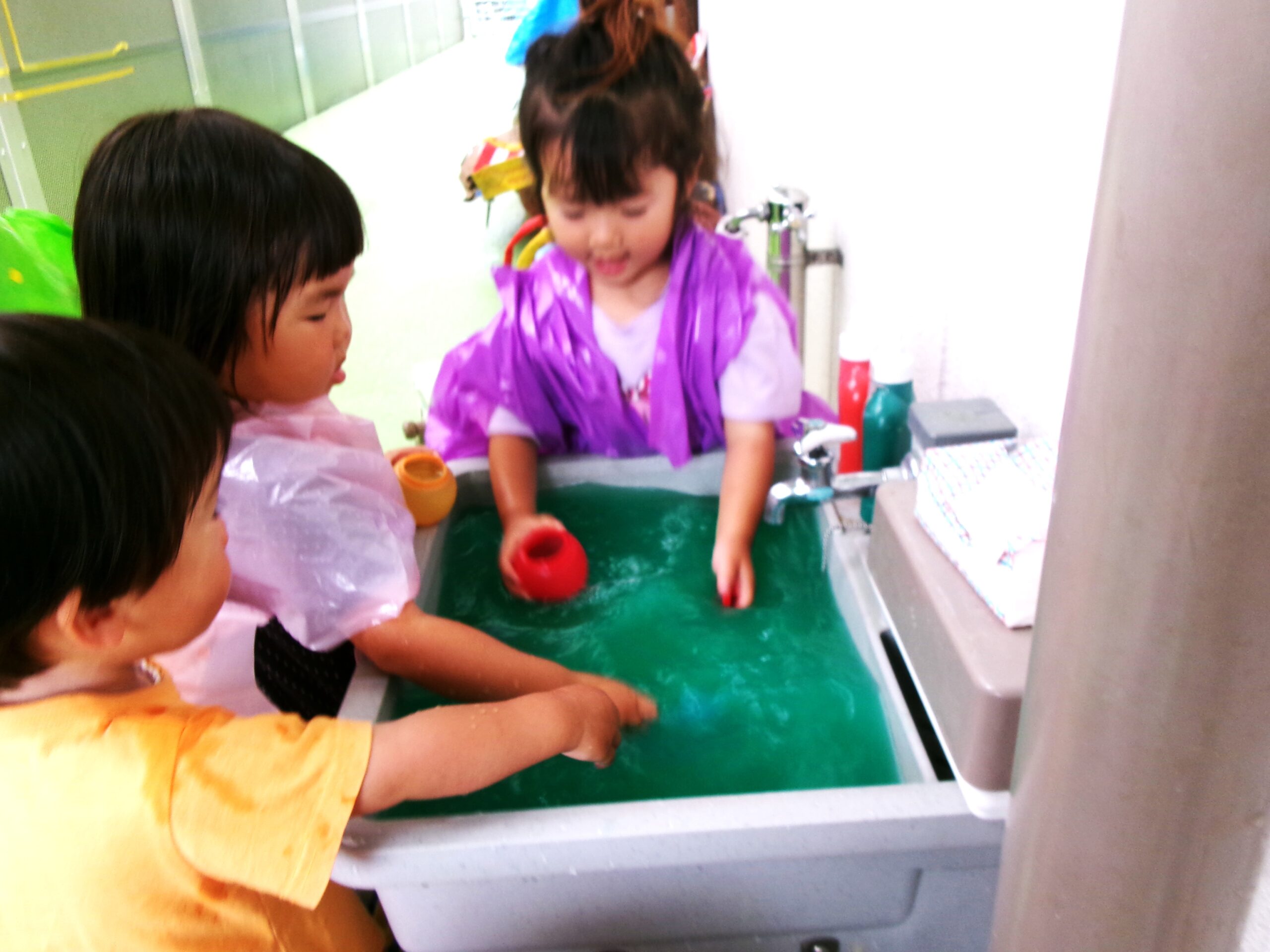 手作りのかっぱを着て色水遊び!きもちいい〜!
