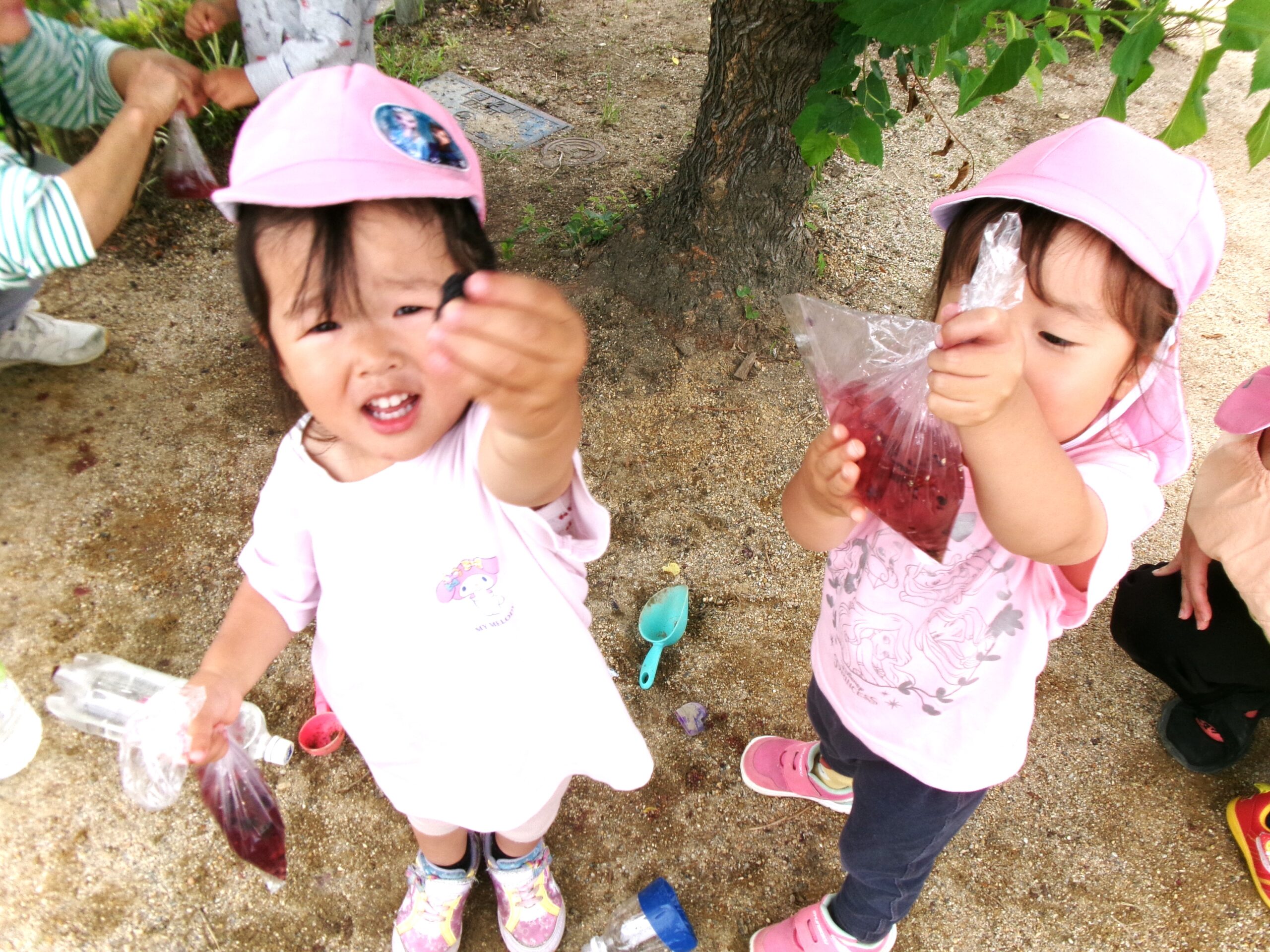 桑の実、見つけたよ!水につけてもみもみすると、ほら!水の色が!!