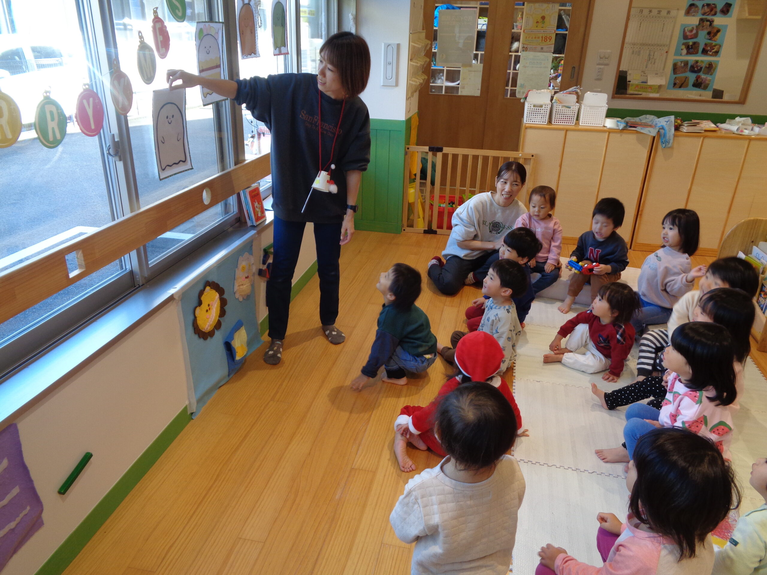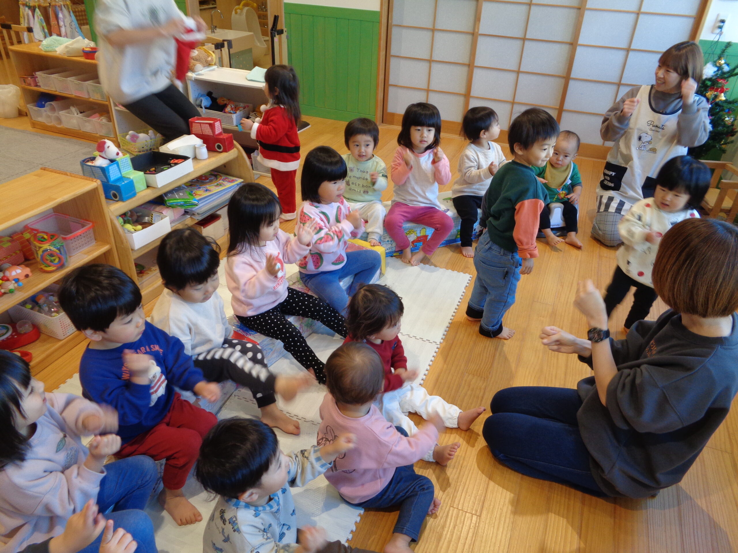 ♬おっすわりや~す、いすどっせぇ~、あんまりのったら、こけまっせぇ~、どっす~ん!!♬公園中に響き渡る元気な声でわらべうた遊び♡