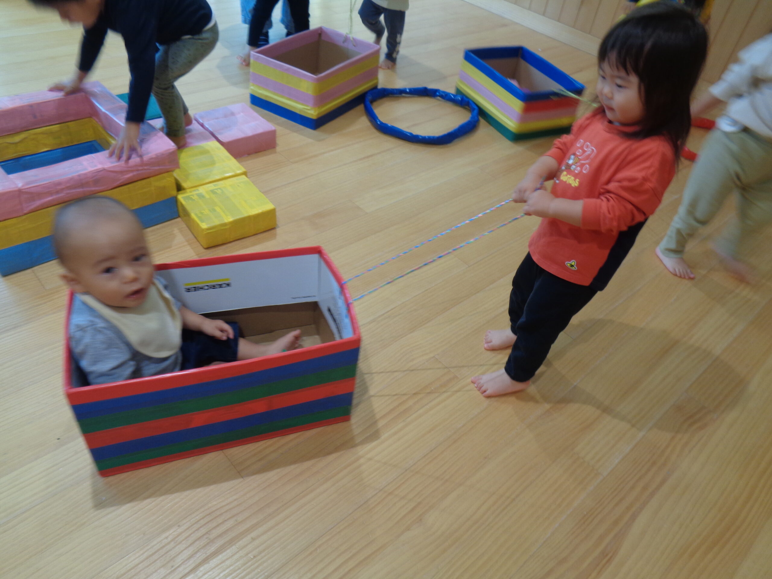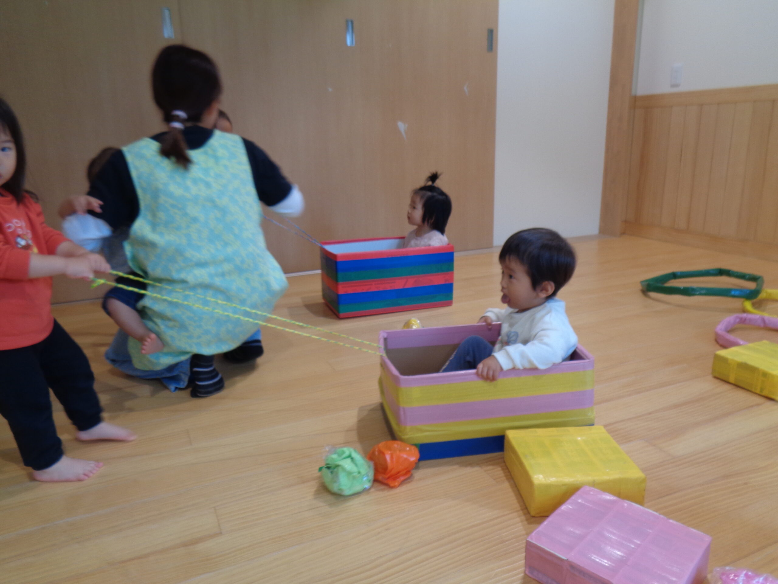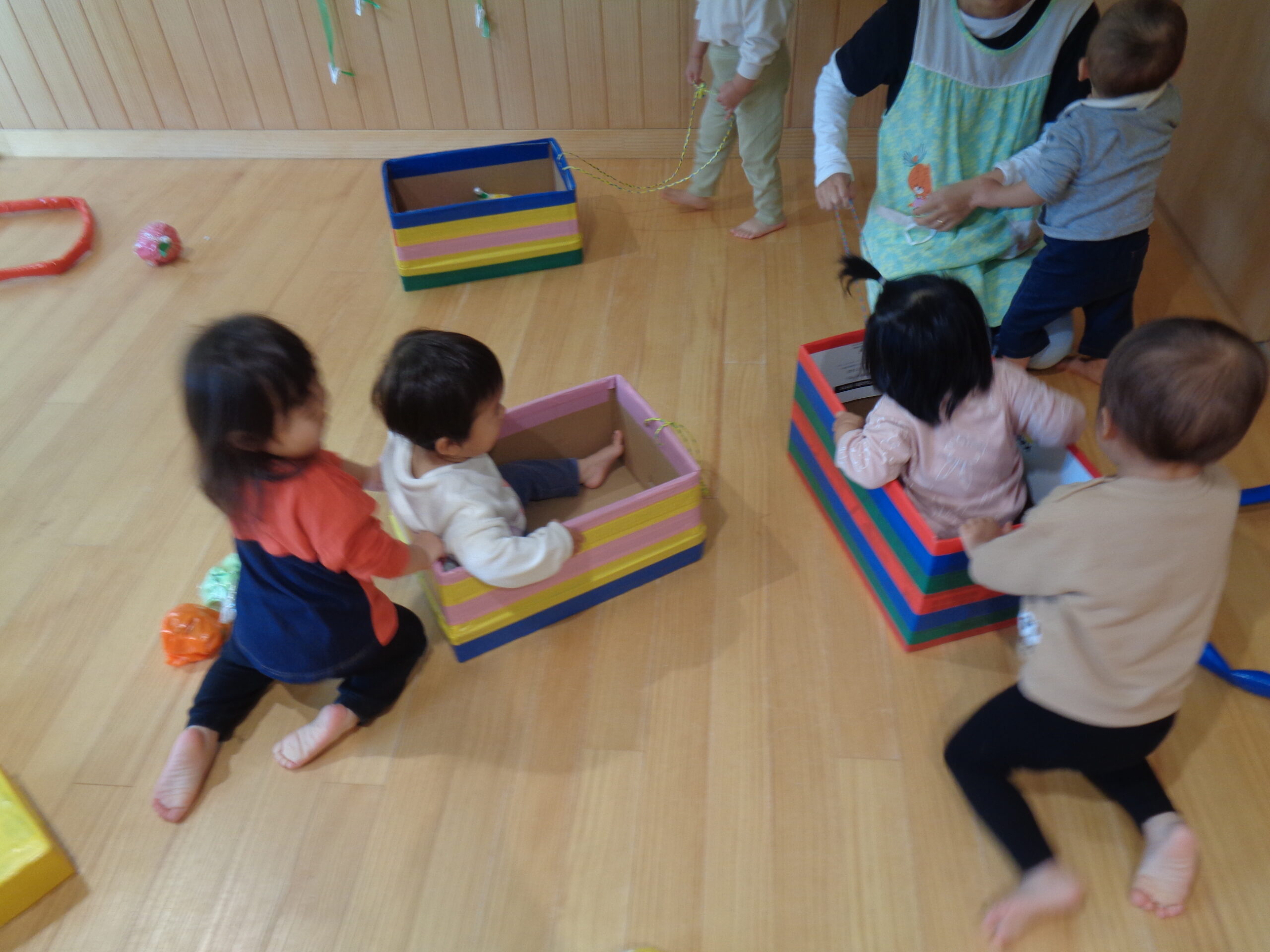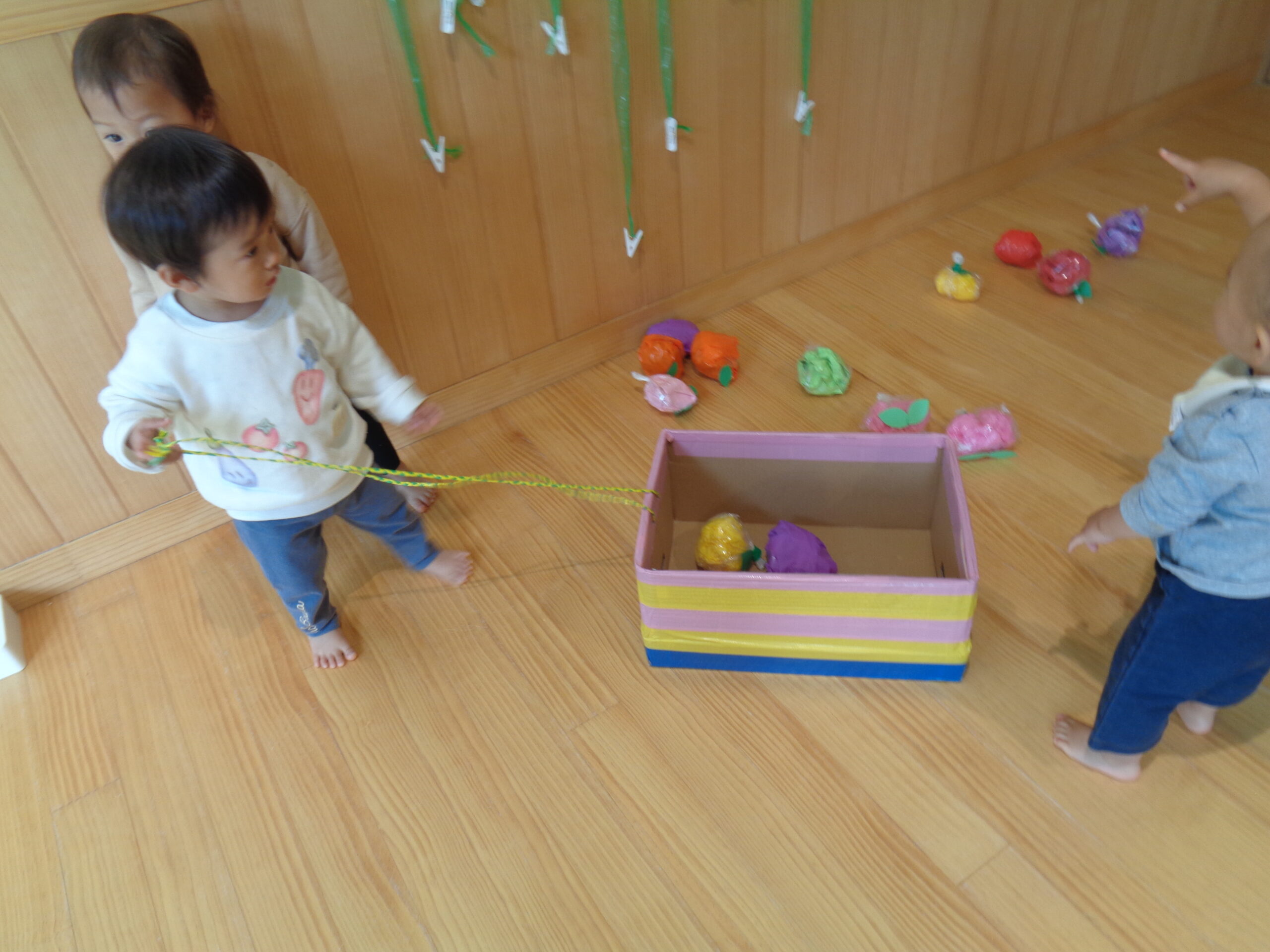 1歳児がホールで遊びました。りんごやミカンなどの果物を狩ったり、箱車で運んだりしましたよ!お友だちも乗って~