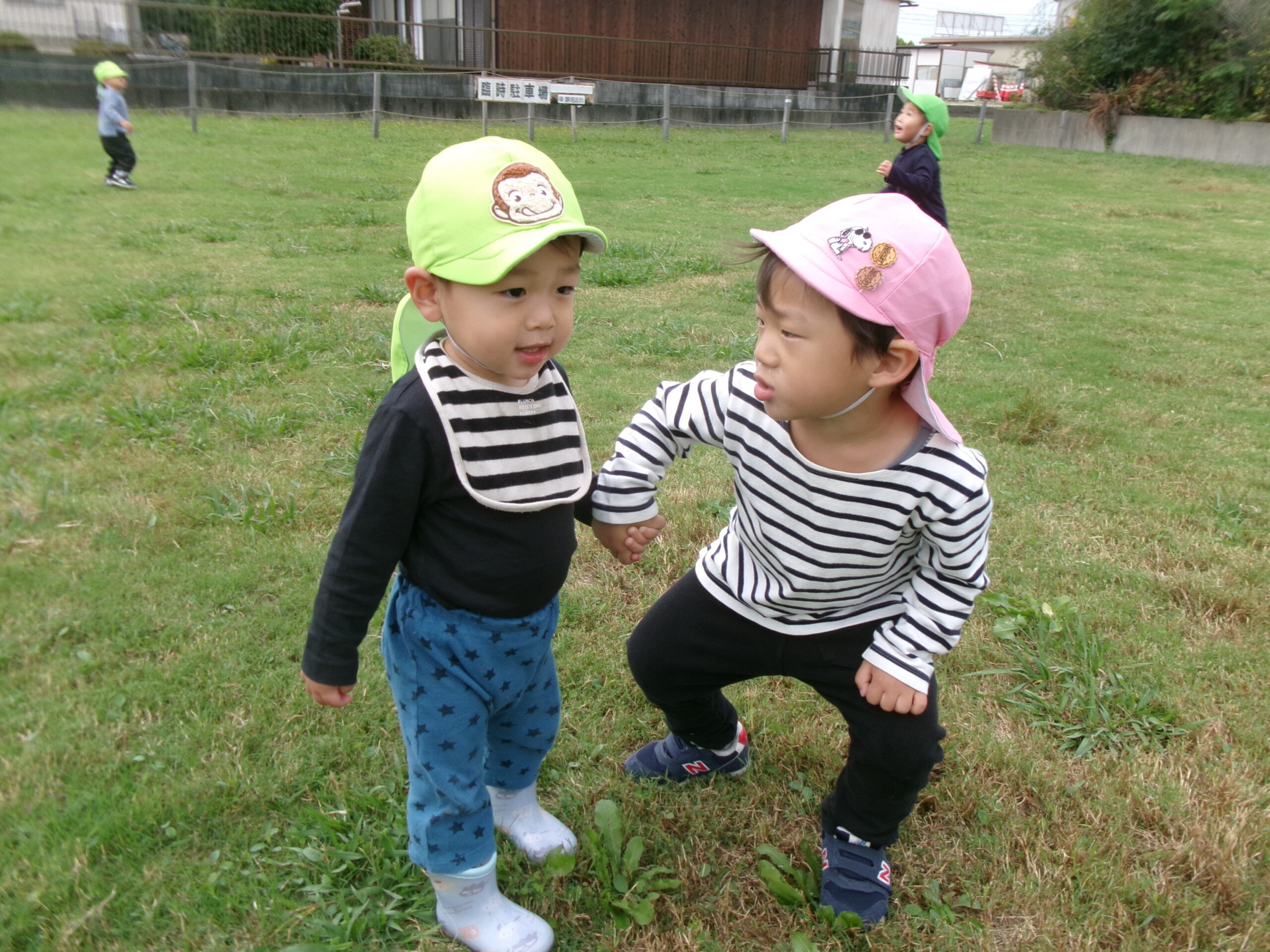 1歳児さんに目線を合わせて「大丈夫?」と語り掛ける2歳児さん。可愛くて愛しくなるひとこまです。