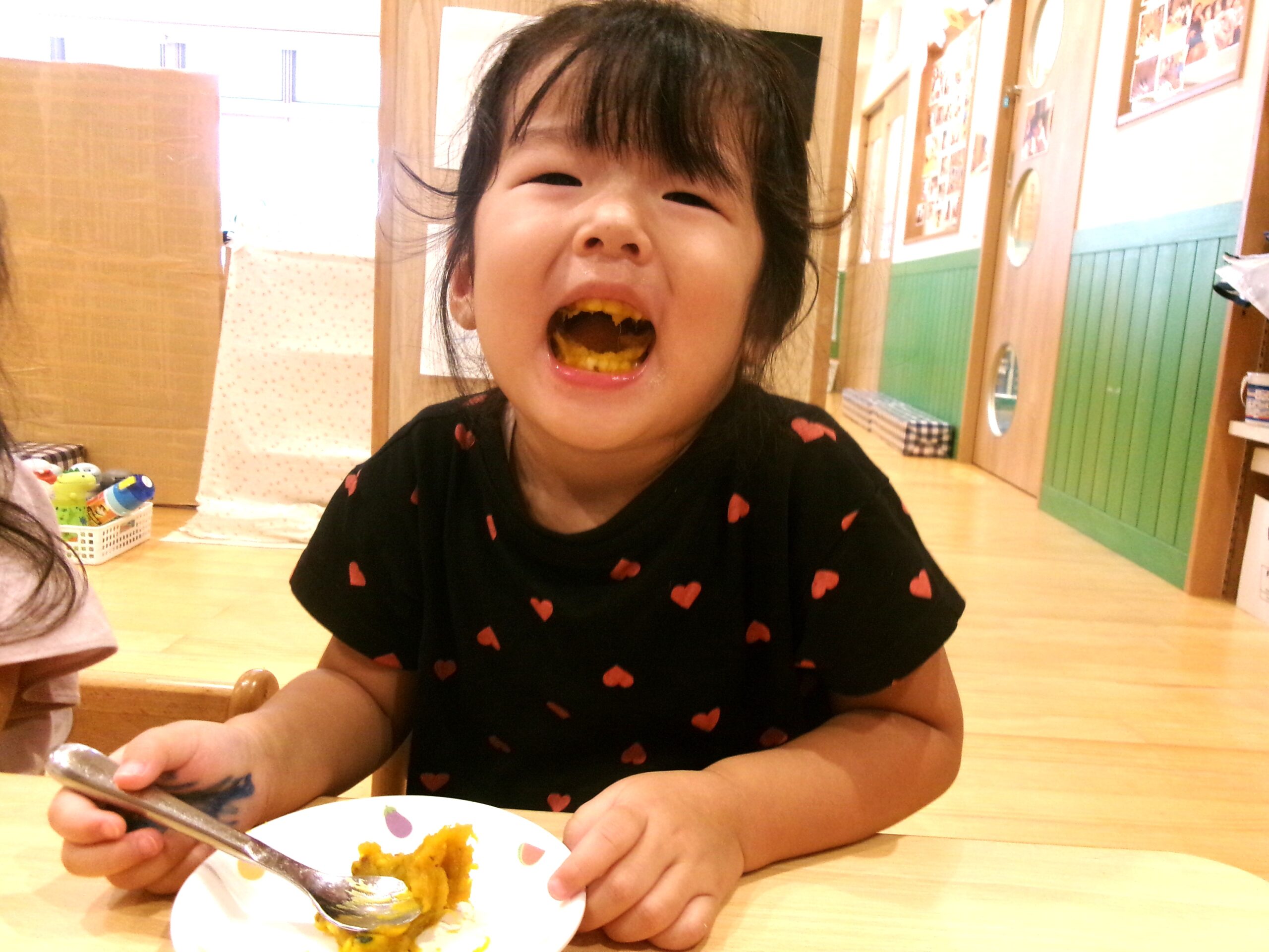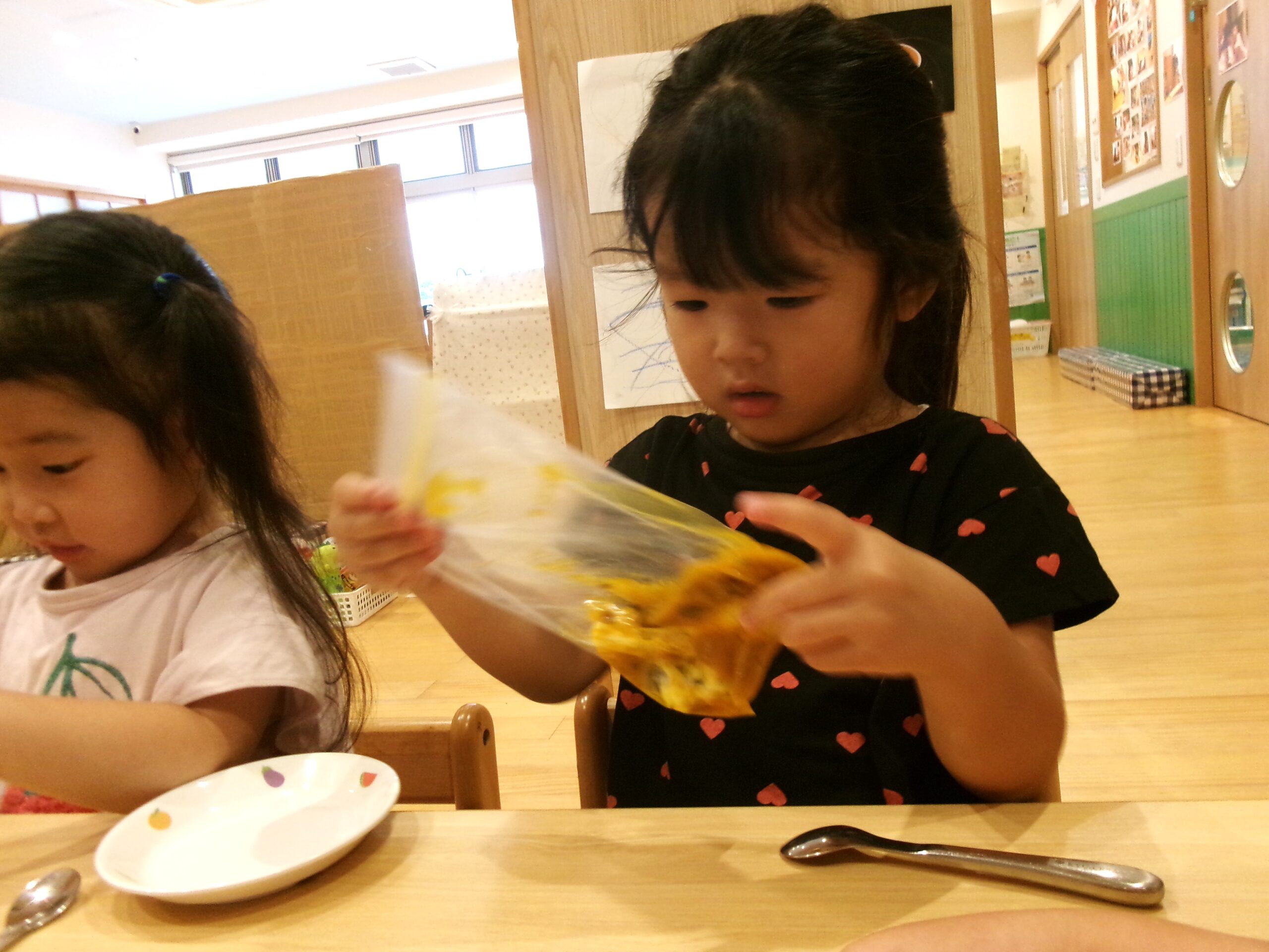 2歳児さんのクッキング!柔らかくしたかぼちゃをジプロックに入れて、もみもみ🎵その中にチーズを入れてもみもみ~♪ぱくっ!ん…ちょっと思ってた味と違うかな(笑)