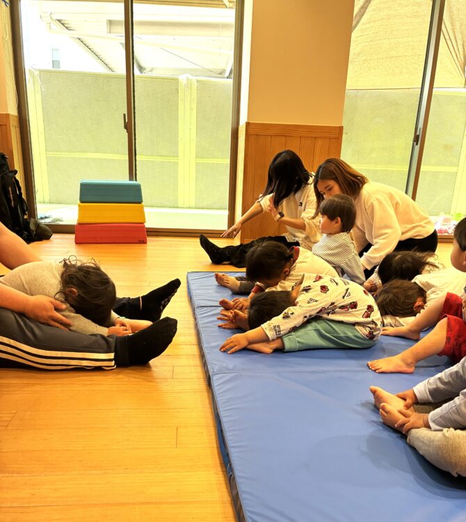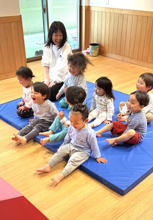 2歳児クラスに進級して初めての体操遊び!身体を前にぺったんこ~!まねっこをしようとする意欲に拍手~♬