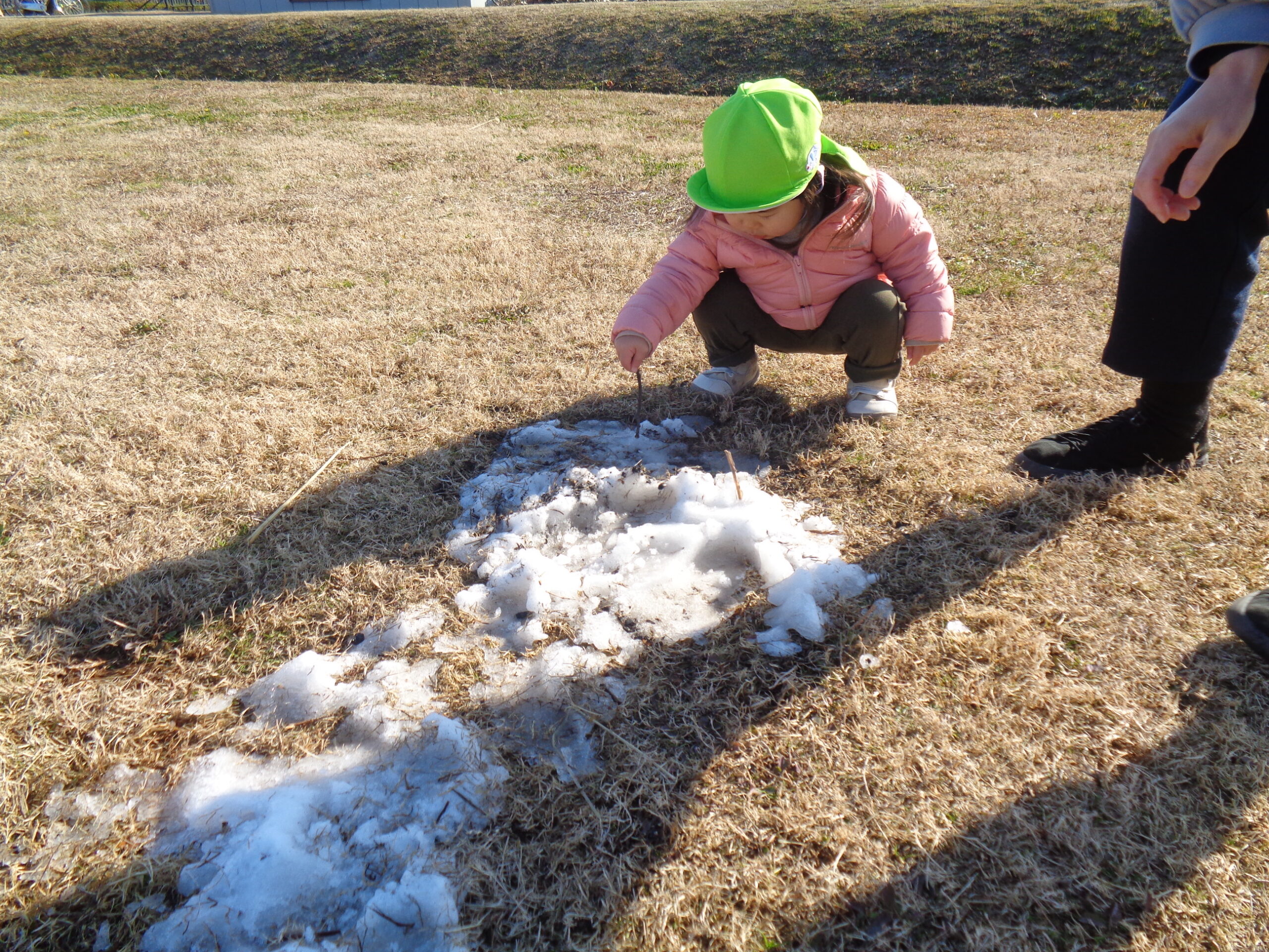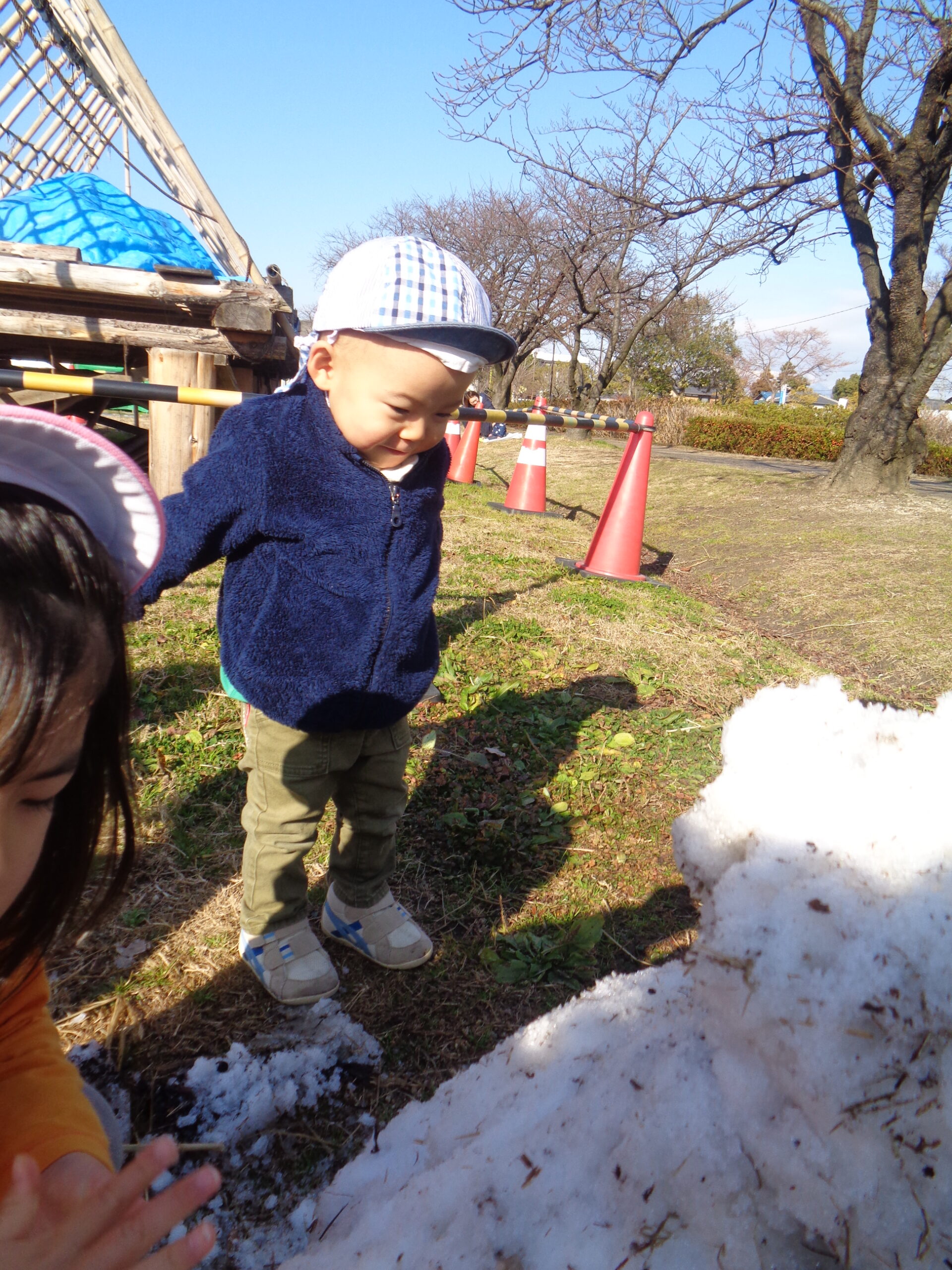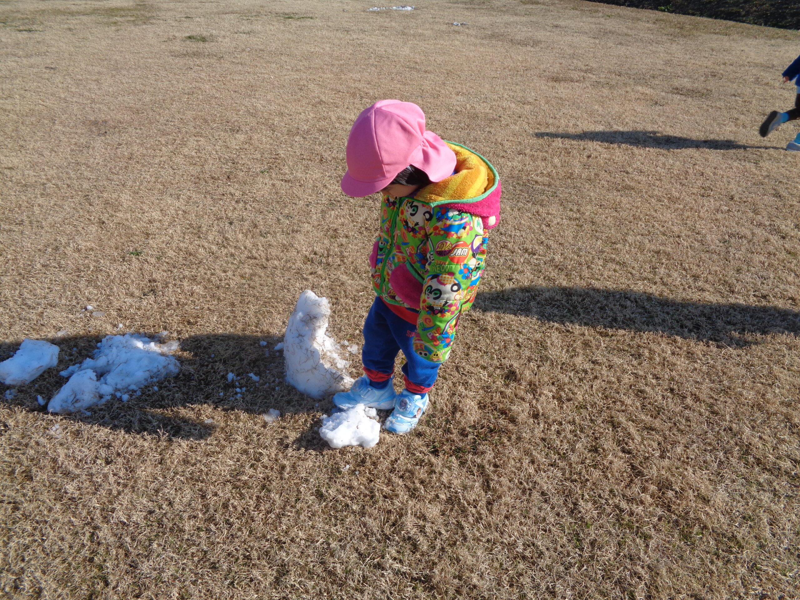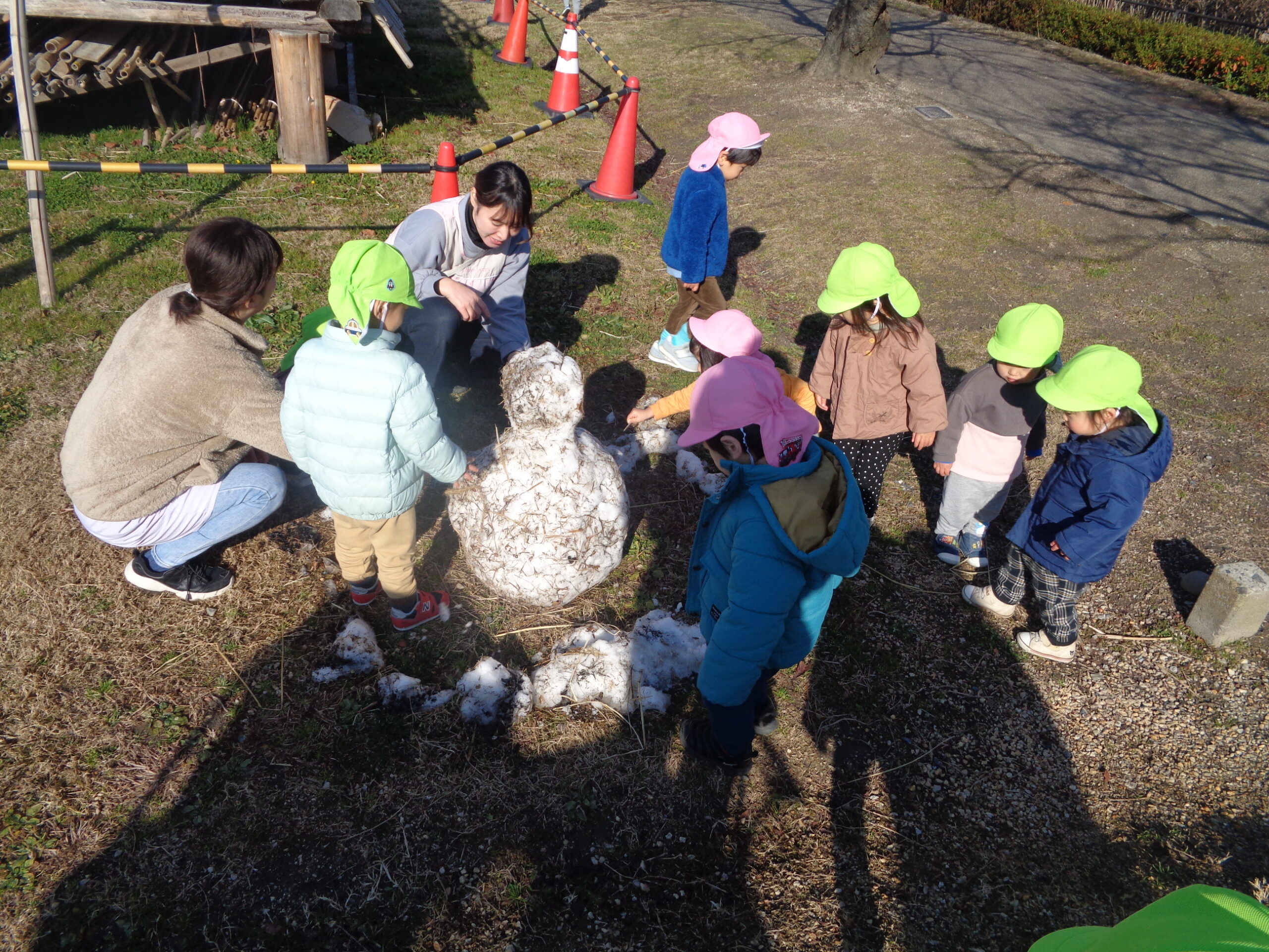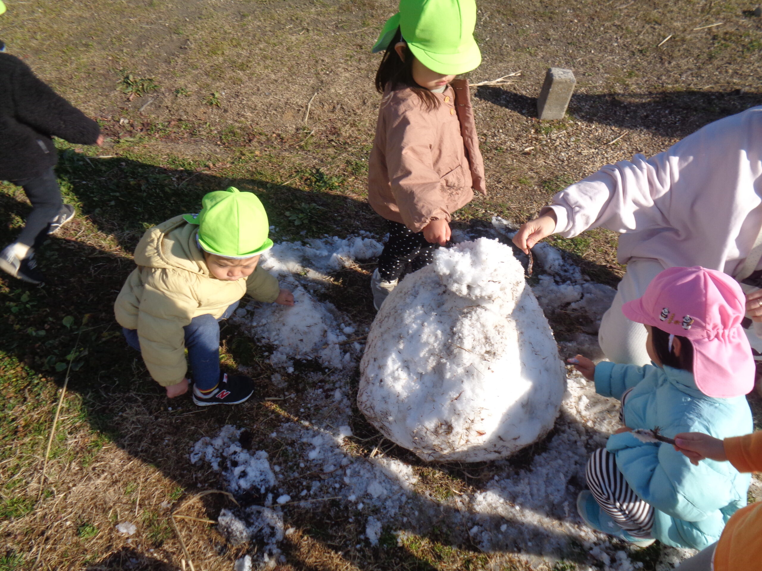 2024.01.09 雪だるま 1月8日、守山市で初雪が降りました。9日の今日は作ってあった雪だるまを見つけて大喜びの子ども達。ツンツンと触れたり、コロコロ転がしてみたり手で触れたりして楽しみました。また、雪が積もるといいなぁ〜